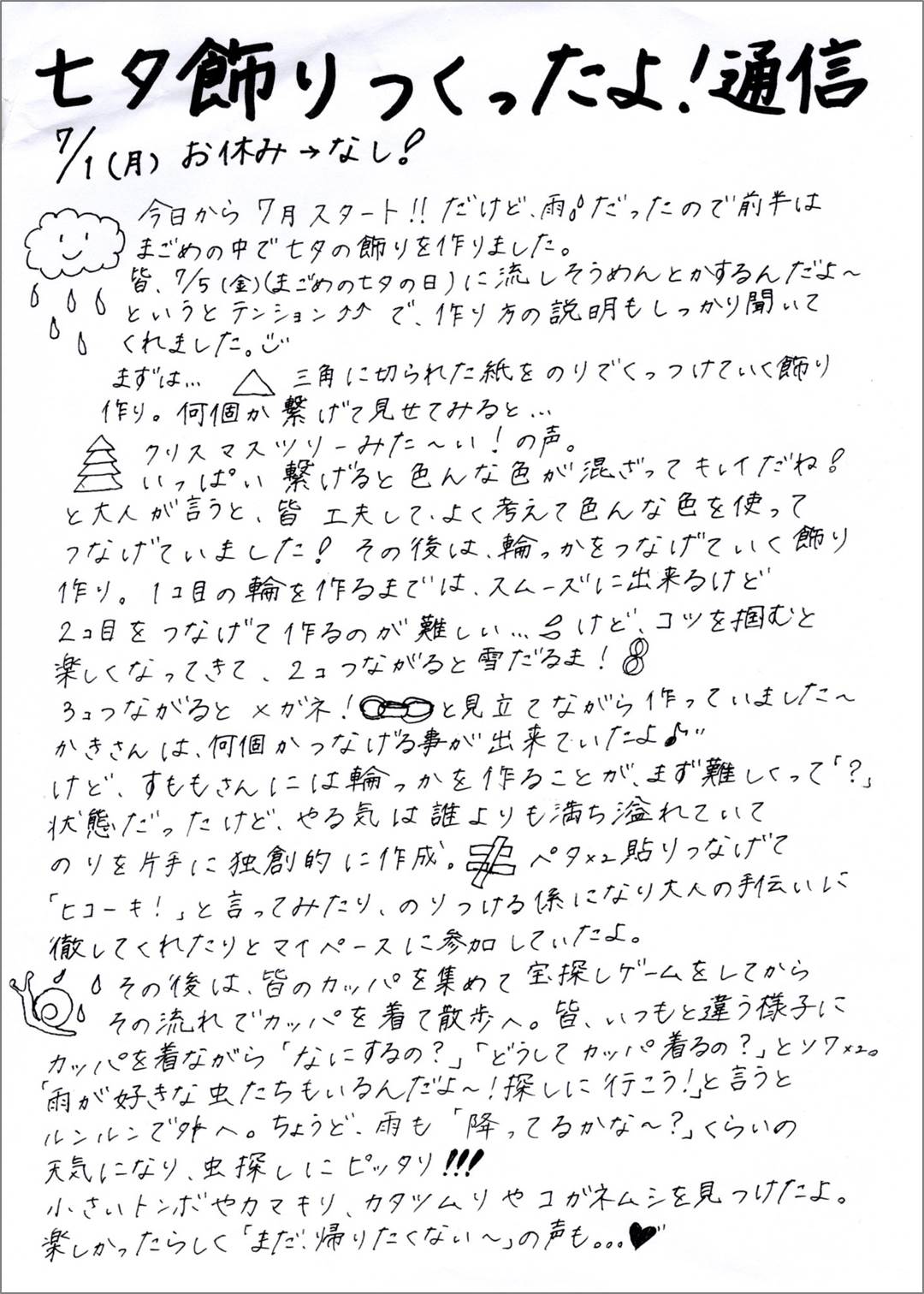 雨だったのでみんなで七夕飾りを作りました。その後はカッパを着て虫探し!